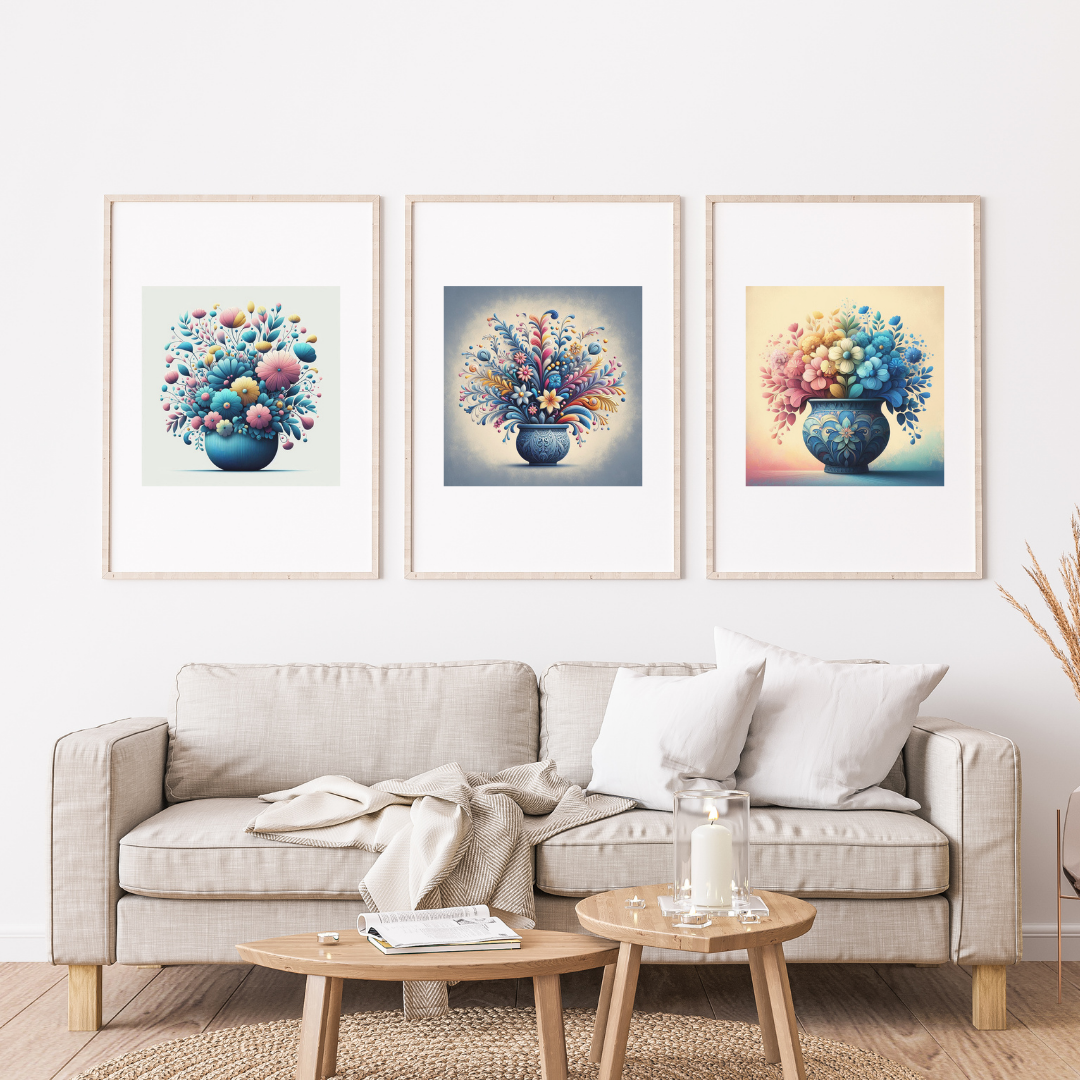 Her biri 30×30 cm boyutunda tasarlanmış üç ayrı eser, mavi vazo içinde stilize edilmiş buketleri pembe, sarı ve mavi tonlarıyla yorumluyor. Birlikte asıldığında uyumlu bir galeri duvarı yaratırken, ayrı ayrı kullanıldığında her biri kendi başına göz alıcı bir sanat eseri oluyor.
